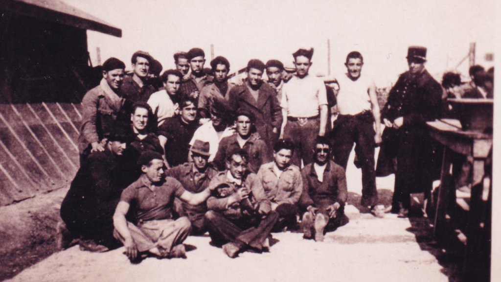 Republicanos, entre os que está o viveirés Antonio López Ferreiro, nun campo de traballo francés en Arxelia