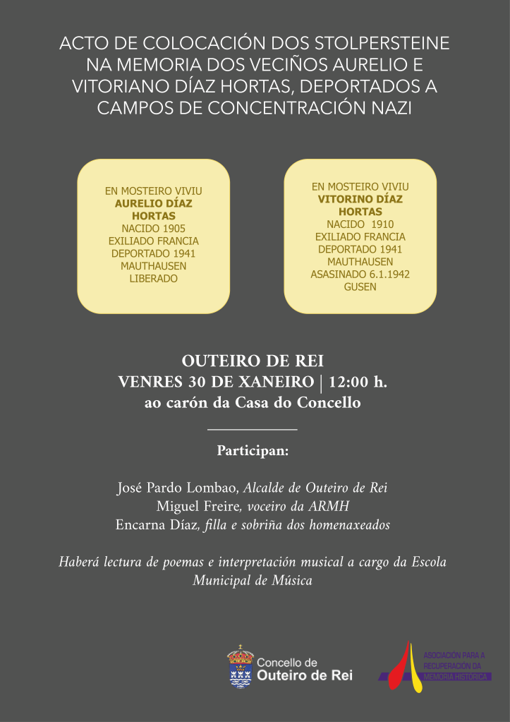 Seguindo ca ronda de colocación dos primeiros Stolpersteine na provincia de Lugo, iniciada o día 29 de xaneiro de 2026 en O Corgo, o día 30 de xaneiro, procedeuse a colocación dos Stolpersteine en homenaxe aos deportados de Outeiro de Rei, os irmáns Aurelio e Vitorino Díaz Hortas.