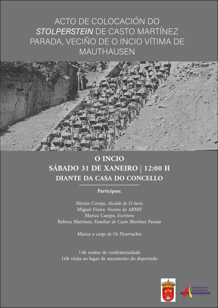 Tras os actos de colocación en O Corgo (29 de xaneiro) e Outeiro de Rei (30 de xaneiro), o 31 de xaneiro procedeuse a colocación do Stolperstein en homenaxe ao deportado de O Incio, Casto Martínez Parada.