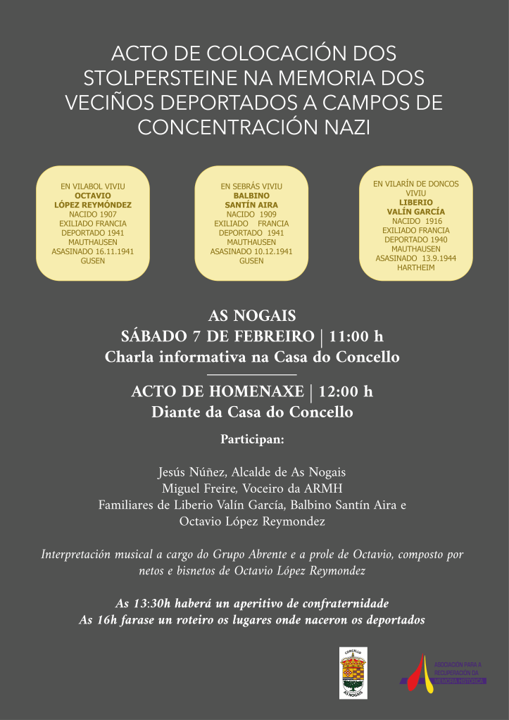 Tras a colocación de catro Stolpersteine en O Corgo, Outeiro de Rei e O Incio a semana anterior, o 7 de febreiro procedeuse a colocación das lastras en As Nogais en homenaxe a Octavio Lopez Reymondez, Balbino Santín Aria e Liberio Valín García, pechando a primeira tanda de colocacións na provincia de Lugo.